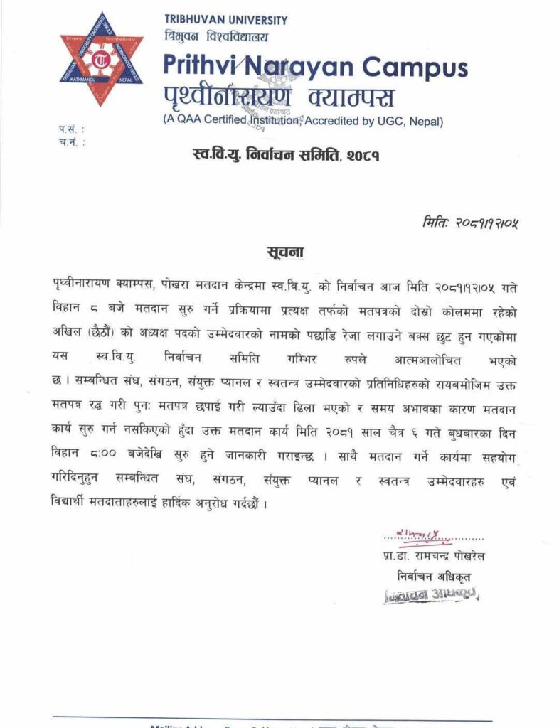`पृथ्वीनारायण क्याम्पस, पोखरा मतदान केन्द्रमा स्ववियुको निर्वाचन आज मिति २०८१।१२।०५ गते विहान ८ बजे मतदान सुरु गर्ने प्रक्रियामा प्रत्यक्ष तर्फको मतपत्रको दोस्रो कोलममा रहेको अखिल (छैठौं) को अध्यक्ष पदको उम्मेदवारको नामको पछाडि रेजा लगाउने बक्स छुट हुन गएकोमा यस स्ववियु निर्वाचन समिति गम्भिर रुपले आत्मआलोचित भएको छ´, निर्वाचन अधिकृत प्राध्यापक डा. रामचन्द्र पोखरेलले जारी गरेको सूचनामा उल्लेख छ ।