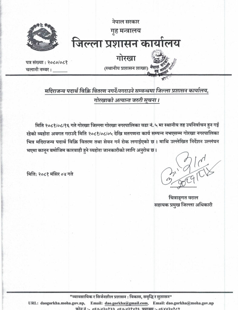 जिल्ला प्रशासन कार्यालय गोरखाले मदिराजन्य पदार्थ बिक्रीवितरण गर्नलाई निषेध गरेको छ ।