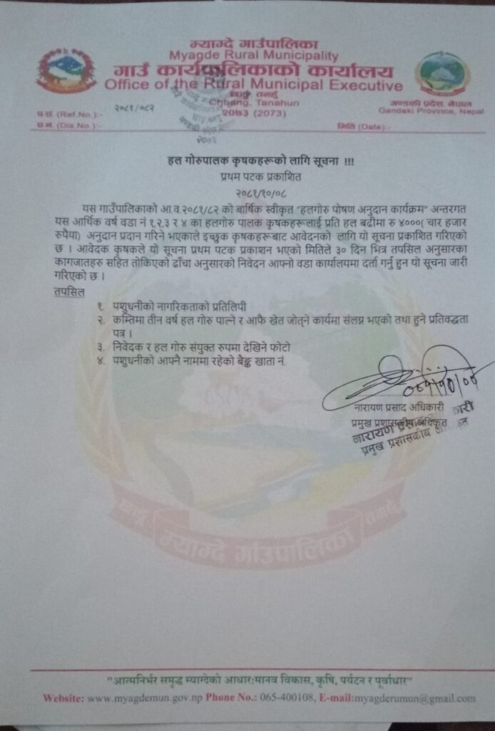 गाउँपालिकाले हल गोरु पोषण अनुदानका लागि आवेदन माग गरेको छ । प्रमुख प्रशासकीय अधिकृत नारायणप्रसाद अधिकारीले जारी गरेको सूचनामा किसानले आफैंले हल गोरुले जोत्ने प्रतिबद्धता, हलगोरु स्पष्ट देखिने तस्बिर र निवेदन पेश गर्नुपर्ने उल्लेख छ । मंगलबार जारी सूचना अनुसार महिना दिनभित्र किसानले आवेदन दिनुपर्नेछ ।